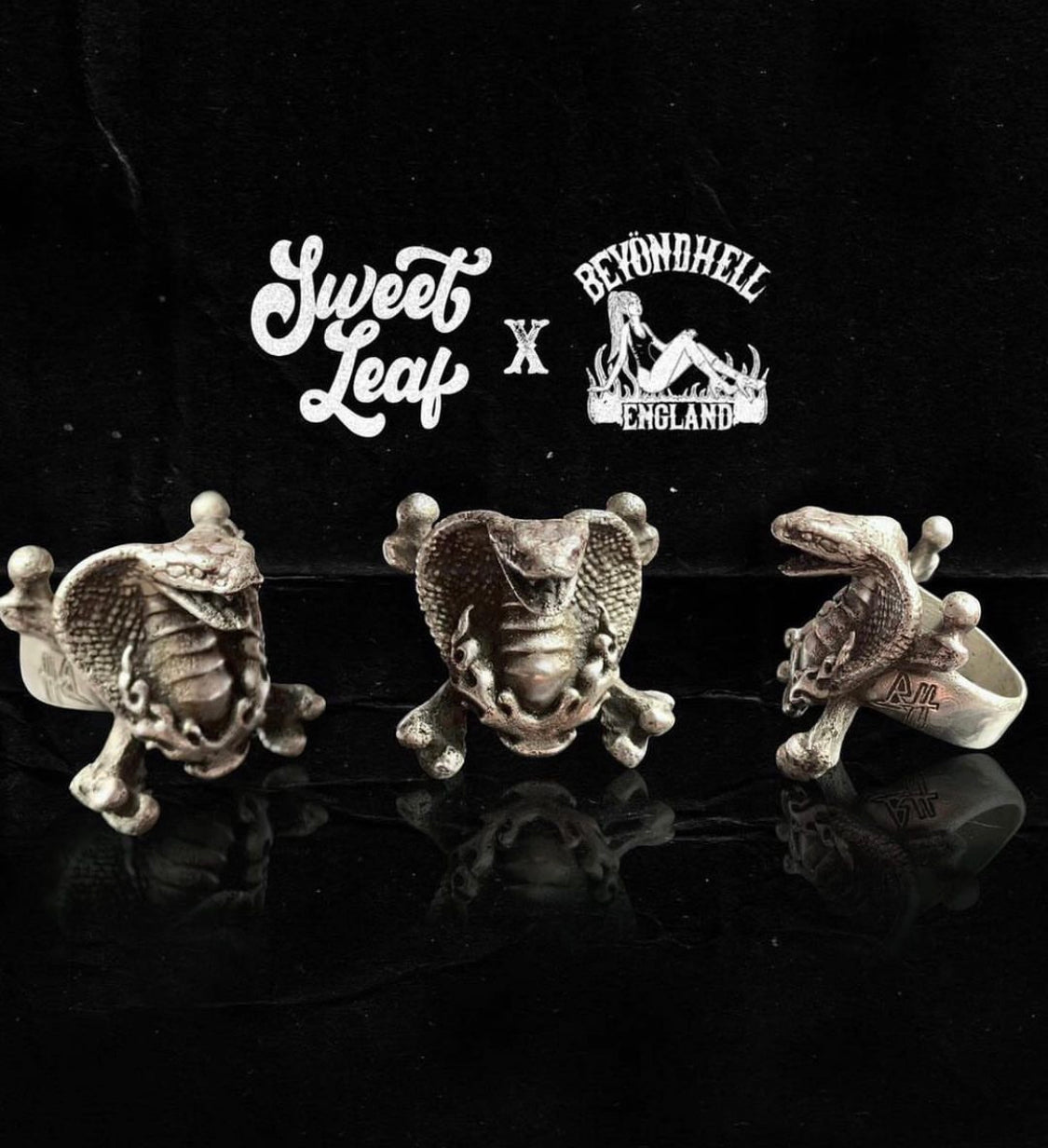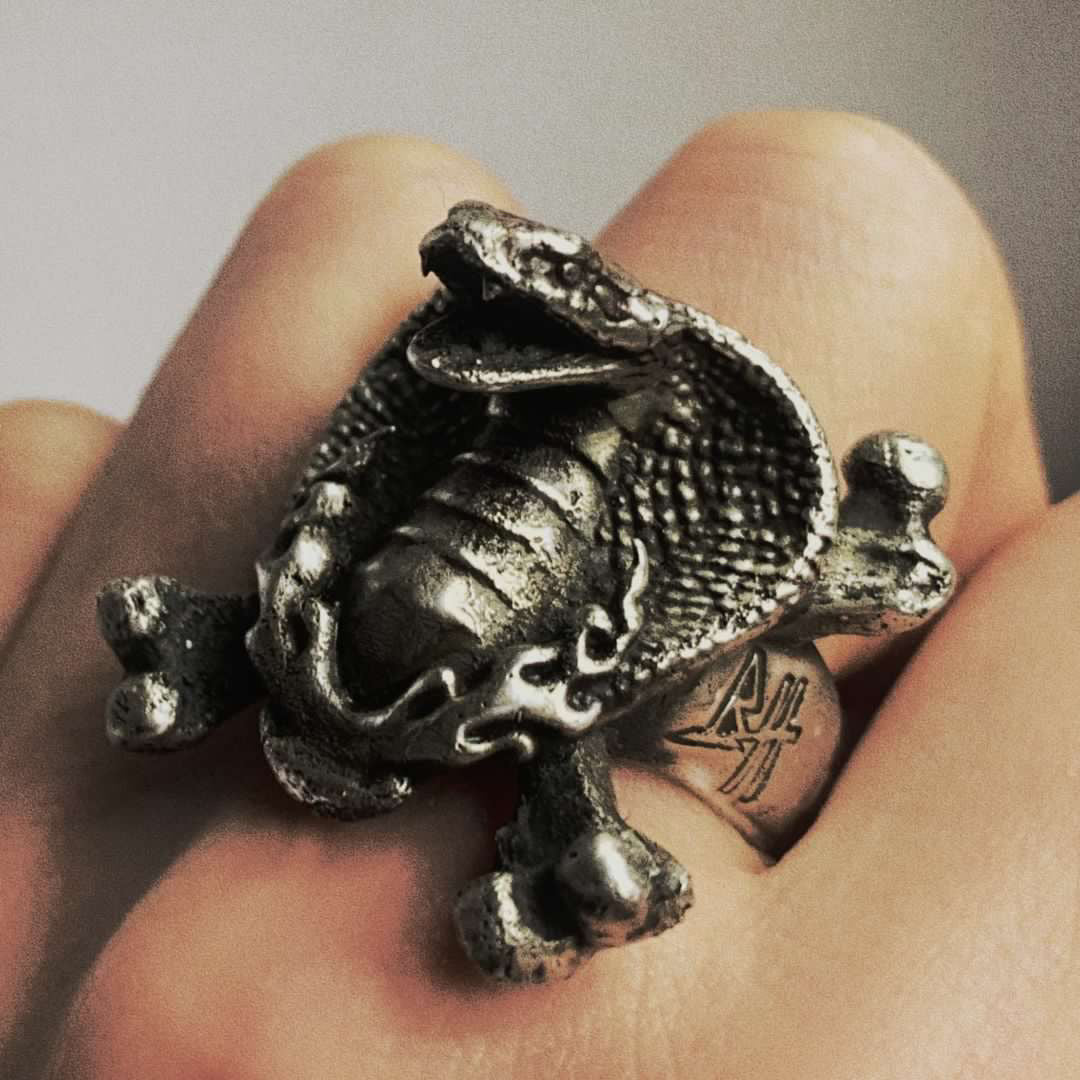 925 Sterling Silver. Made in collaboration with Beyond Hell. This striking statement ring has the Cobra with crossbones and flames. Highly detailed and a comfortable fit.