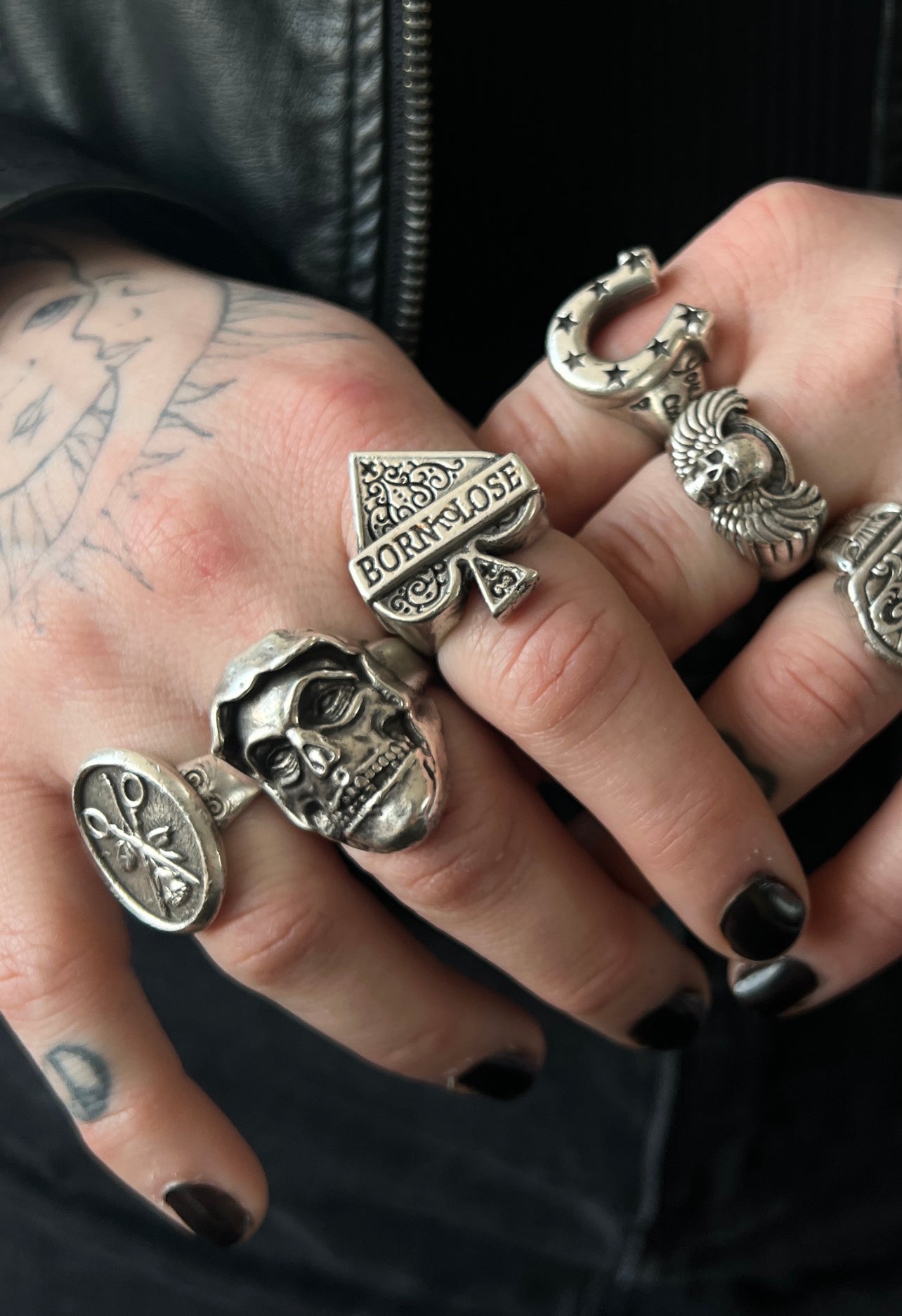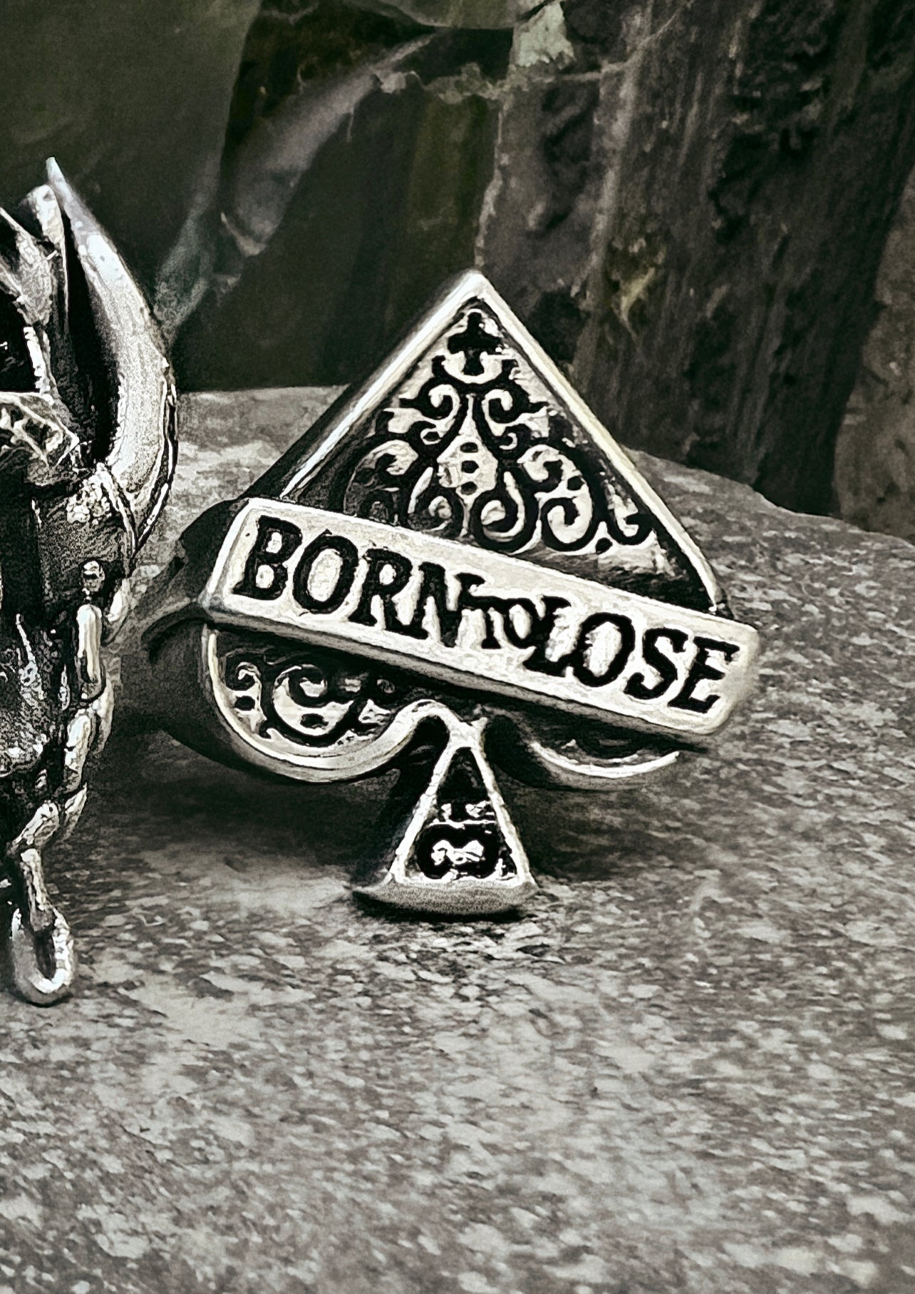 925 Sterling Silver. Flat backed spade ring with with a banner draped across the front featuring the words Born To Lose.