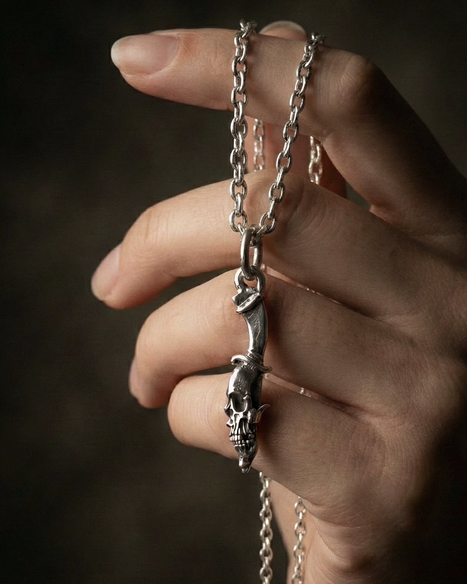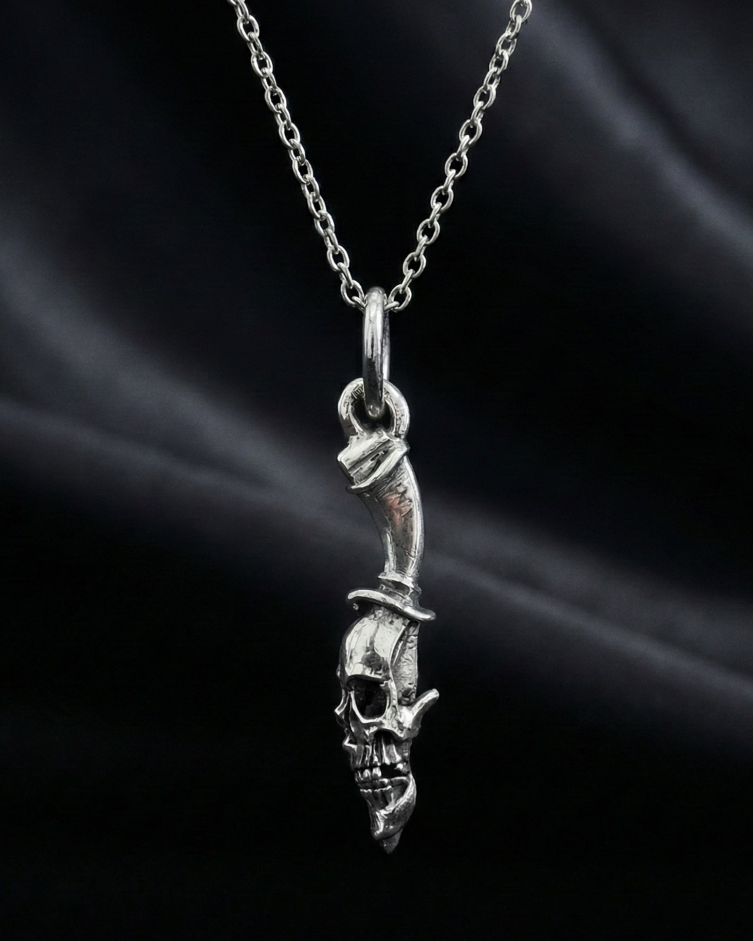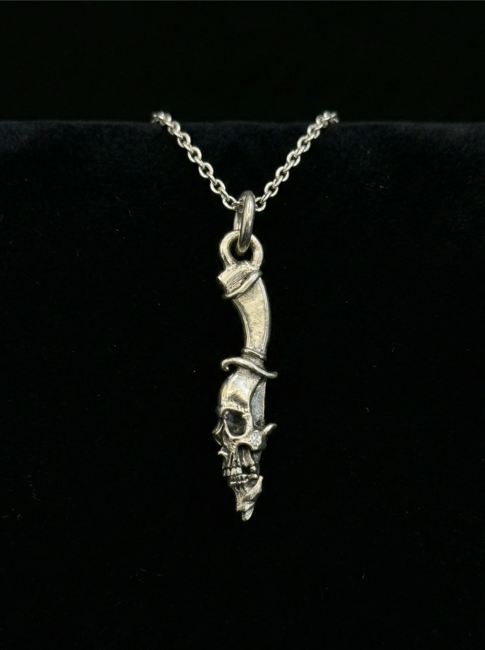 925 Sterling Silver Dagger pendant. This symmetrical pendant has the same skull design on each side