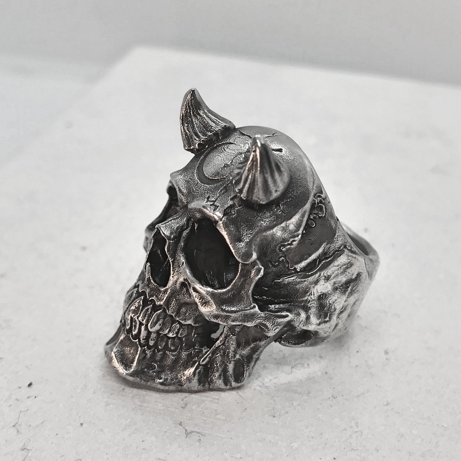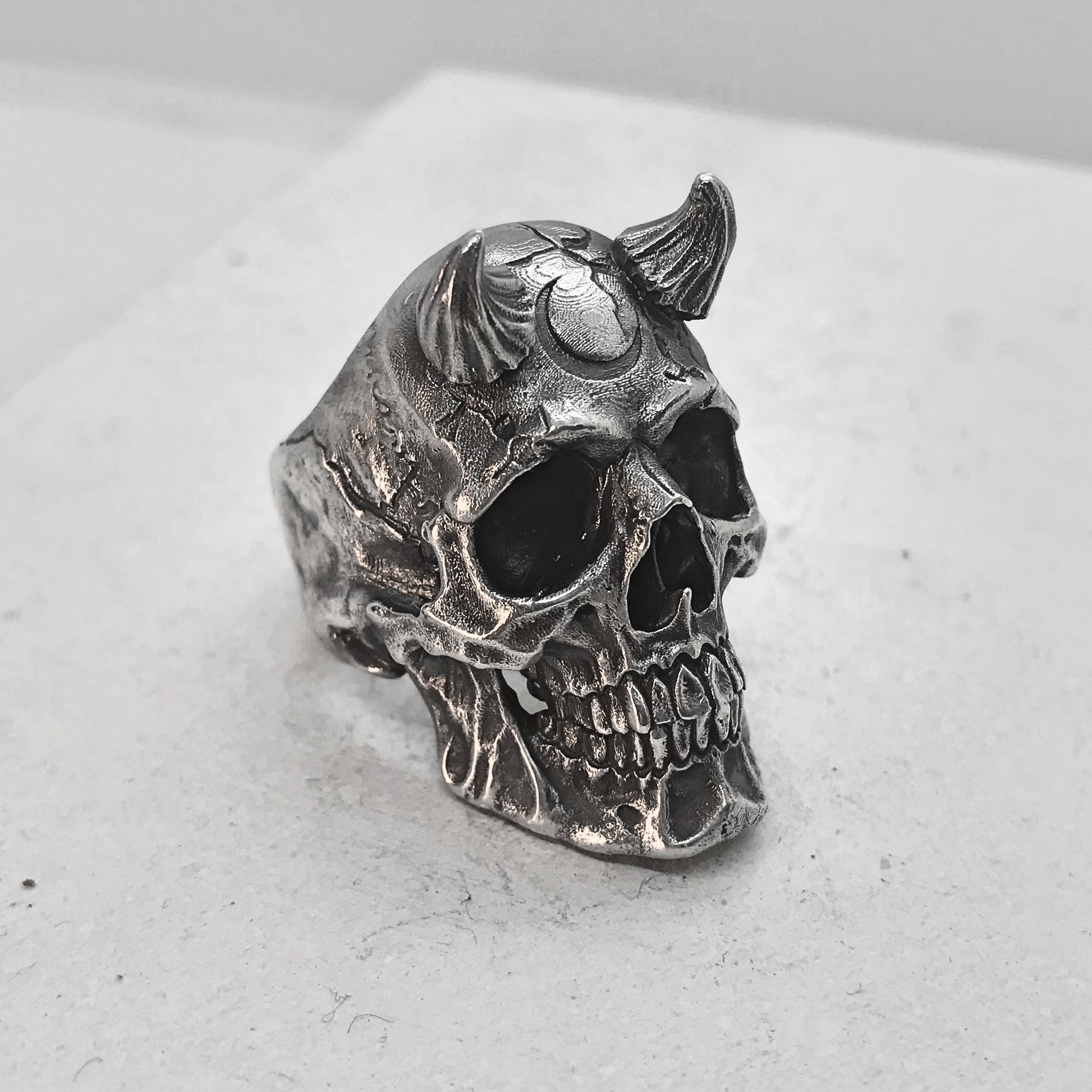 925 Sterling Silver. Distressed skull engraved with a crescent moon between two horns. Hollowed back. 45-50 grams of silver depending on size.