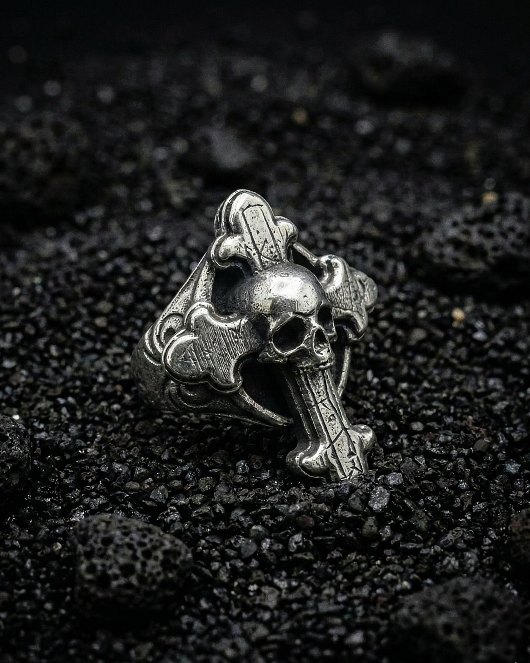 925 Sterling Silver. Simple skull upon a distressed crucifix.